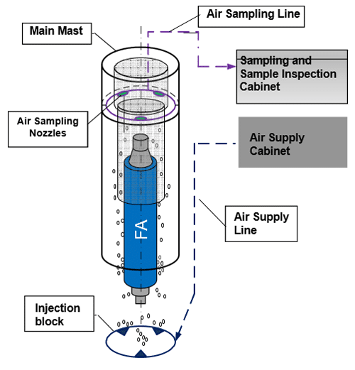 The IMSS operates by delivering compressed air under the liner of each fuel assembly. A gas sample is taken from the inner cavity of the FHM above the water level and is measured with a beta-activity meter.