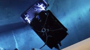 Before entering containment, the Kinegge field engineer team completed an FME pre-check on the decon tooling and cables in a staging area. Once completed, the team set up the ROV-crawler control station on the refueling floor away from the edge of the refueling cavity, in a lower-dose space separate from other outage operations. After a complete system function check, the decon tool was connected to the vacuum pump in the cavity. The tool was then deployed into the water using the overhead crane, taking precaution to minimize disruption to the water surface. The team then cleared the shroud cavity of air bubbles by cycling the vacuum pump power, such that the vehicle was appropriately trimmed. The final step was the deployment of a high definition camera into the cavity to monitor decon operations and umbilical location from a bird’s eye perspective, to support the operator’s situational awareness.