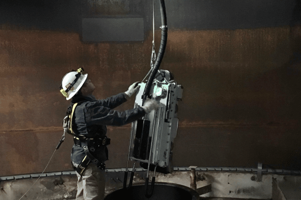Kinegge performs a 2-step advanced assessment to determine the feasibility of a tank before an inspection. The first step is comprised of a tank drawing review and a client questionnaire. The second step includes an on-site deployment of an intrinsically safe camera system to capture images of the tank floor and assess the presence and volume of debris or sludge. At this same time, magnetic sampling is gathered to determine whether any debris is ferromagnetic. Conducting this thorough feasibility assessment allows Kinegge to ensure an inspection is possible in a tank’s current condition or whether desludging is required in advance.